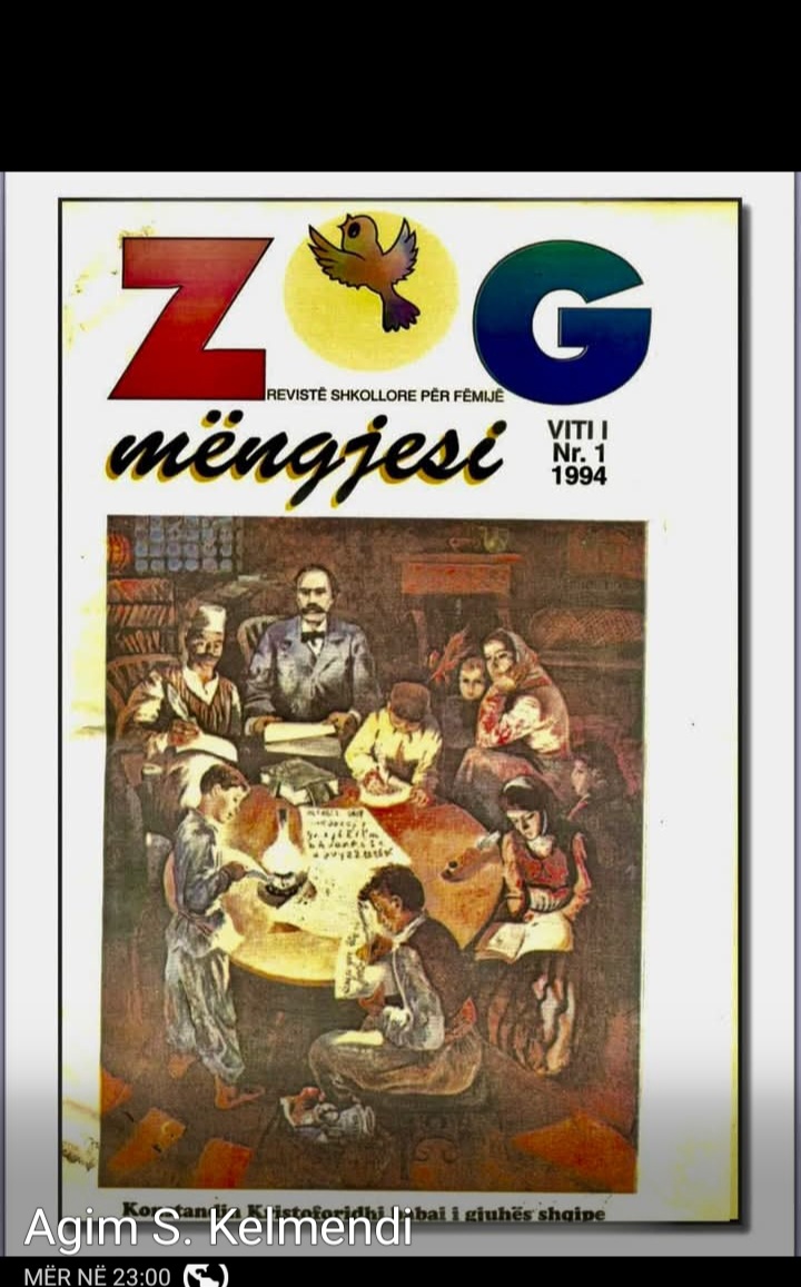Nxënësit në klasë, me tekste shkollore, si dhe krahas tyre në bankën shkollore, e pandarë për 32 vite revista “Zog Mëngjesi”
