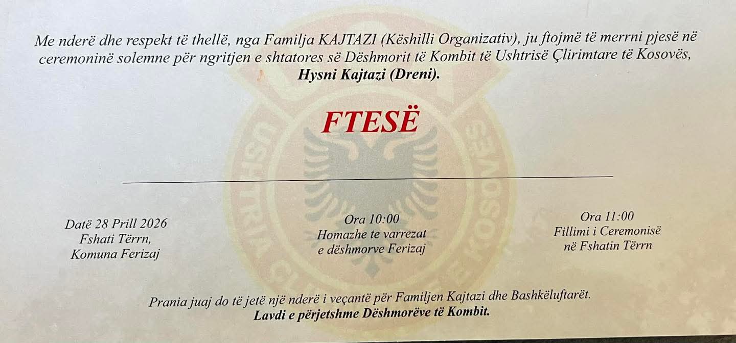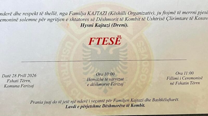 Me ndjenjë të thellë respekti dhe krenarie, ju ftojmë të merrni pjesë në këtë moment të veçantë për fshatin tonë — tubimin solemn për zbulimin e shtatores së dëshmorit të kombit, Hysni Kajtazi – Dreni.